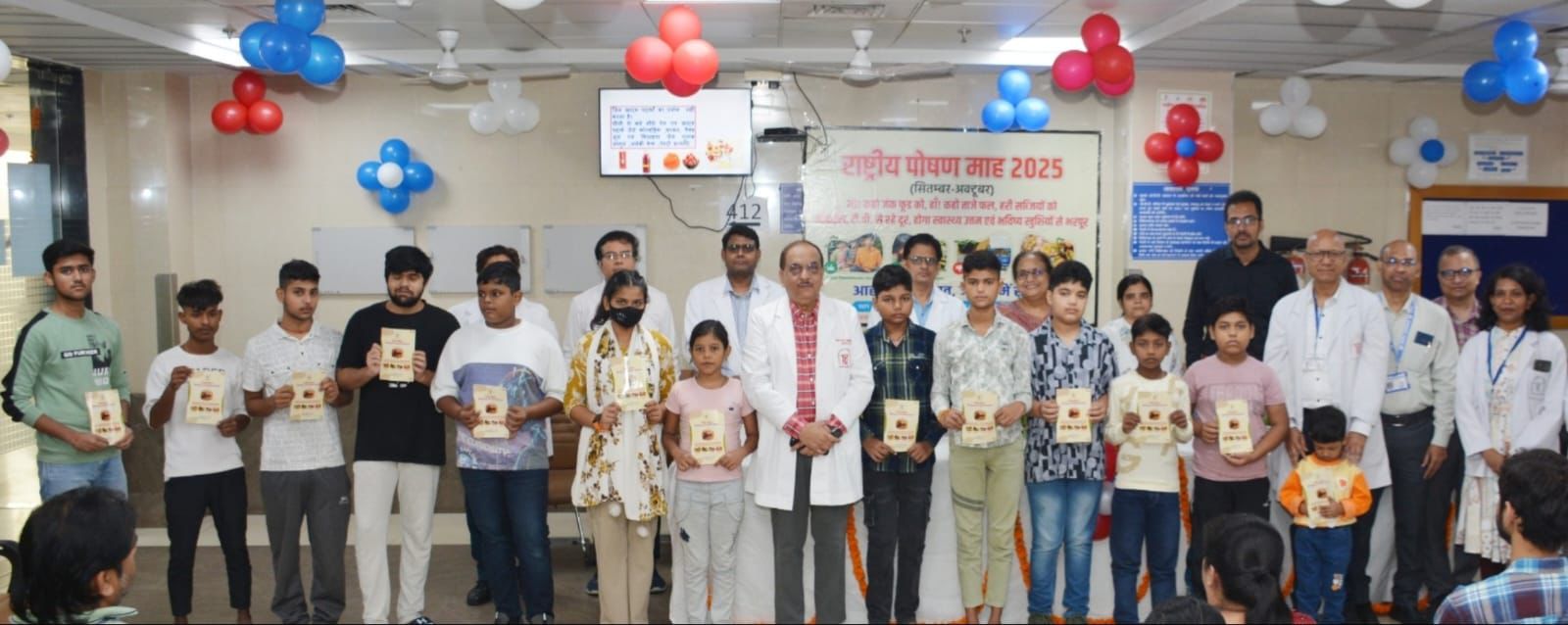 Lucknow:The theme of this year awareness Programme was “Obesity in children” . The programme was organised by the Department of Pediatric Gastroenterology at SGPGIMS, Lucknow. The event was graced by Director, Prof. R K Dhiman, Chief Medical Superintendent, Medical Superintendent, Prof.& HOD Pediatric Surgery Dr. Basant Kumar, Prof. Praveer Rai, Prof Samir Mohindra and HOD Pediatric Gastroenterology Prof Ujjal Poddar, Prof. Anshu Srivastava, Prof L K Bharti,Dr Ajayaravind and Dr Nitu . On the eve of National Nutrition Month, Director Prof. R K Dhiman along other faculty members released a booklet on “Awareness and management of obesity/Fatty Liver in children” written by Department of Pediatric Gastroenterology with the input from all the faculty members of the department. Later this booklet was distributed to all children free of cost. Director of Institute Prof Dhiman while addressing to gathering said that obesity is increasing very fast specially in urban children. Prof. Dhiman emphasized that adequate amount of sleep is very necessary to maintain the healthy life. Prof & HOD Dr Ujjal Poddar emphasized on the importance of balance diet in children. Chief Medical Superintendent Dr Devendra Gupta has given his important input regarding prevention of obesity in children. Medical Superintendent Prof. Rajesh Harshwardhan emphasized on electronic display of